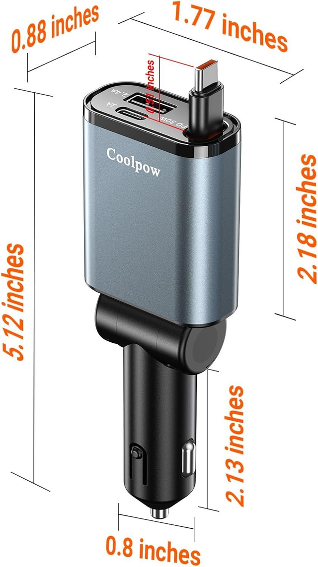 Chargeur Voiture Rétractable USB-C/USB-A – Charge Rapide 45W Coolpow (Allume-cigare)